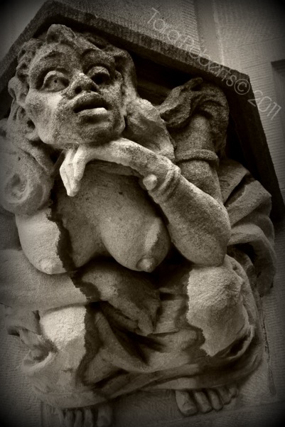 * The photo is of one of the many Grotesques that adorn the outside of Biltmore House in Asheville, NC. These ornamental structures can be animal or human figures, and feature outlandish expressions or are in bizarre poses. Gargoyles are found at roof edges and are typically downspouts, channeling rain away from the building.