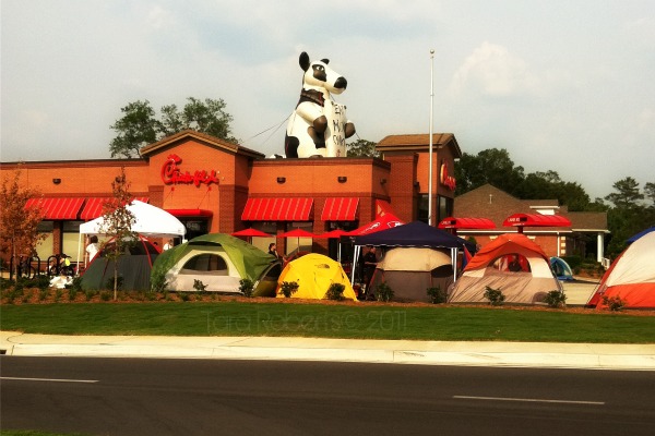 This week a refugee camp set up along side the parking lot of a newly hatched Chick-fil-a restaurant in town. Rumor was that when the restaurant officially opened for business, the first 100 customers would be rewarded with free Chick-fil-a for a year. Tents and other camping gear filled the grassy areas surrounding the building early the day before its opening.