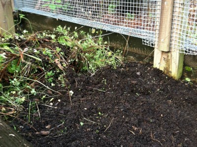 The first order of business was to weed the planters. Hershey, Lab digger extraordinaire, helped, making the process go that much faster.