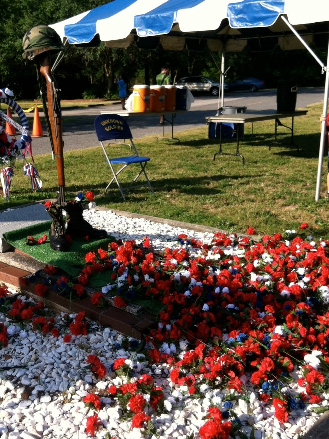 Less than a mile from the start was the Fallen Warrior memorial. Participants laid red and white carnations at the helmet and boots shrine.