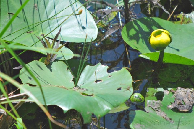 “Water lilies cover most of the surface of the pond, some of the buds have opened. Dragonflies and honey bees flit from one to the other. Sometimes a big bullfrog hops out the water, landing with a slap on a broad, green leaf. It sits on the pad, waiting for a cricket to hop by. Their long tongues are so fast you can miss it when they catch one.”