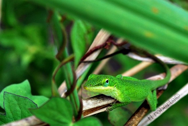 Thank you. These little lizards have bright red neck pouches that they can inflate if they feel threatened. They are really that bright green.