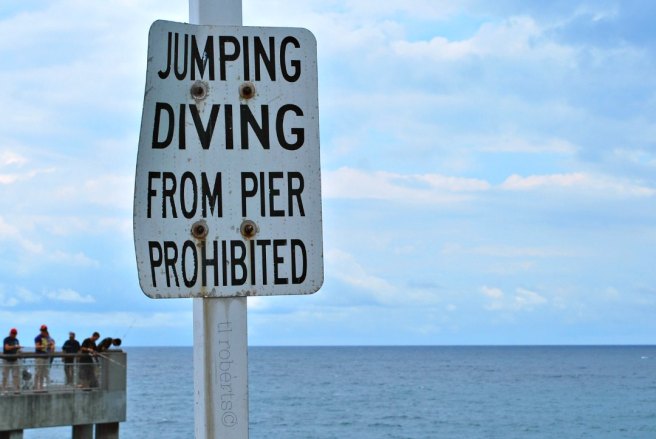 First day there, I strolled out on the fishing pier. Massive concrete stanchions carried the boardwalk far enough out into the surf that you couldn’t see the bottom of the channel.