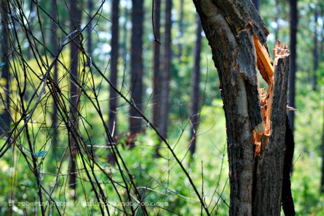 Pushing aside low hanging boughs and thorny vines, Leo slowly made his way deep into the woods. As the trees thinned out, Leo stepped into a wide clearing. In the center stood a tall, rangy pine. About a quarter of the way up the narrow bole, the tree had split nearly in two, twisted from above like something had attempted to wrench it from the ground. Fresh sap seeped from the wound like thick, sticky blood.