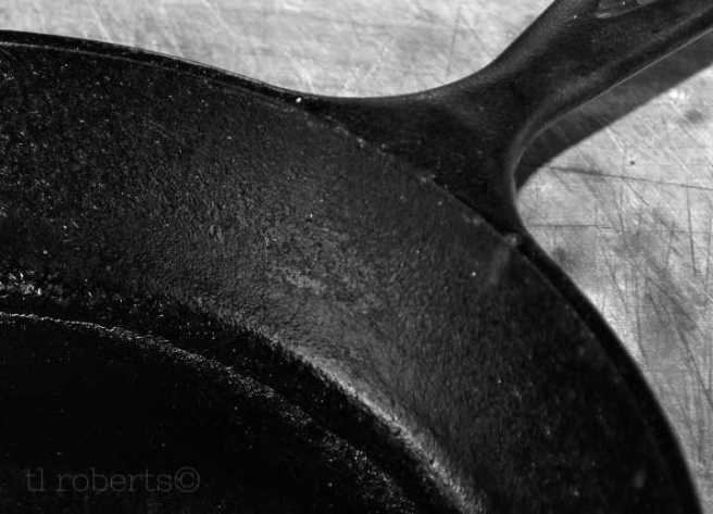 The skillets got slathered in shortening and baked at very high temperatures for hours to build up that thick, black coating that repels whatever I put them through. Each time they go through the fire, the stronger their “armor.”