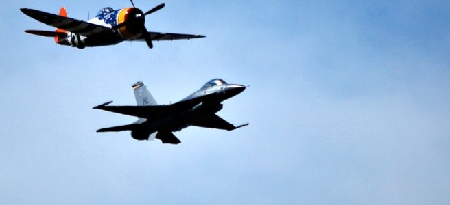 Representing more than 60 years of military flight, an F16 fighter jet and a P47 Thunderbolt.